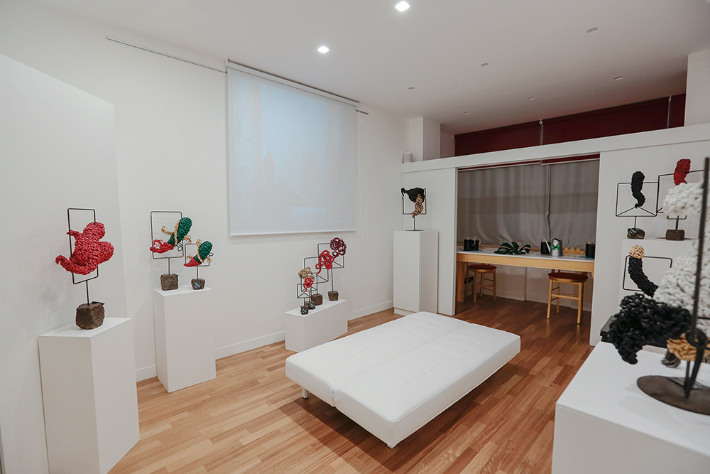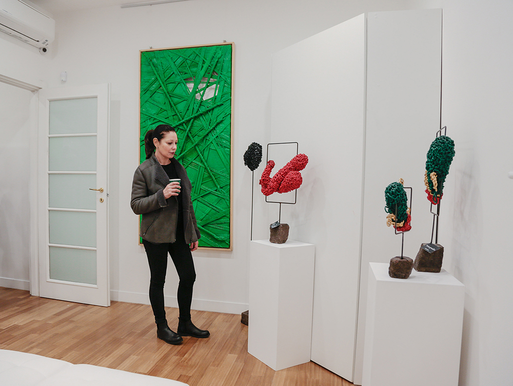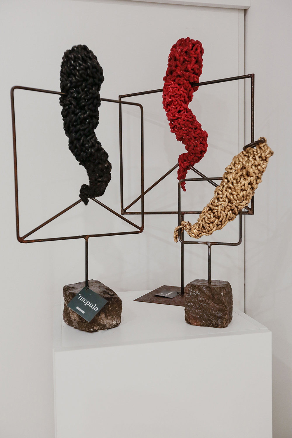 A queste quattro stanze si unisce uno spazio comune, Napoli (con i suoi credo, le sue leggende, il suo spirito fortemente devoto ma anche esoterico), dove ogni mese sarà accolta una mostra d’arte diversa e l’artista vivrà, per tutto il periodo, in una stanza, avendo la possibilità di interagire con i turisti. E questo è un altro obiettivo di Monica P: mettere a disposizione degli artisti, senza gallerie e musei che accolgano le loro opere, uno spazio in cui ci possa essere una sana interazione tra uomo e arte. La direzione artistica di questo spazio è affidata all’artista Marco Coda, che porterà in questo luogo la sua personale “Napul’è”, in cui simboli antichi si mescolano con il nuovo, in quel profumo di tradizione e superstizione che si respira nella cultura partenopea. Un ciottolo, un corno, legano subito la memoria a passato e presente, a folclore e cultura. Legami che Coda tiene insieme con le sue corde che legano, si fanno mani, braccia, colla. Quelle corde che sono da sempre sapientemente intrecciate, tratto distintivo e filo conduttore delle sue opere belle, fresche, nuove, eppure antiche. Una fusione tra vecchio e nuovo.