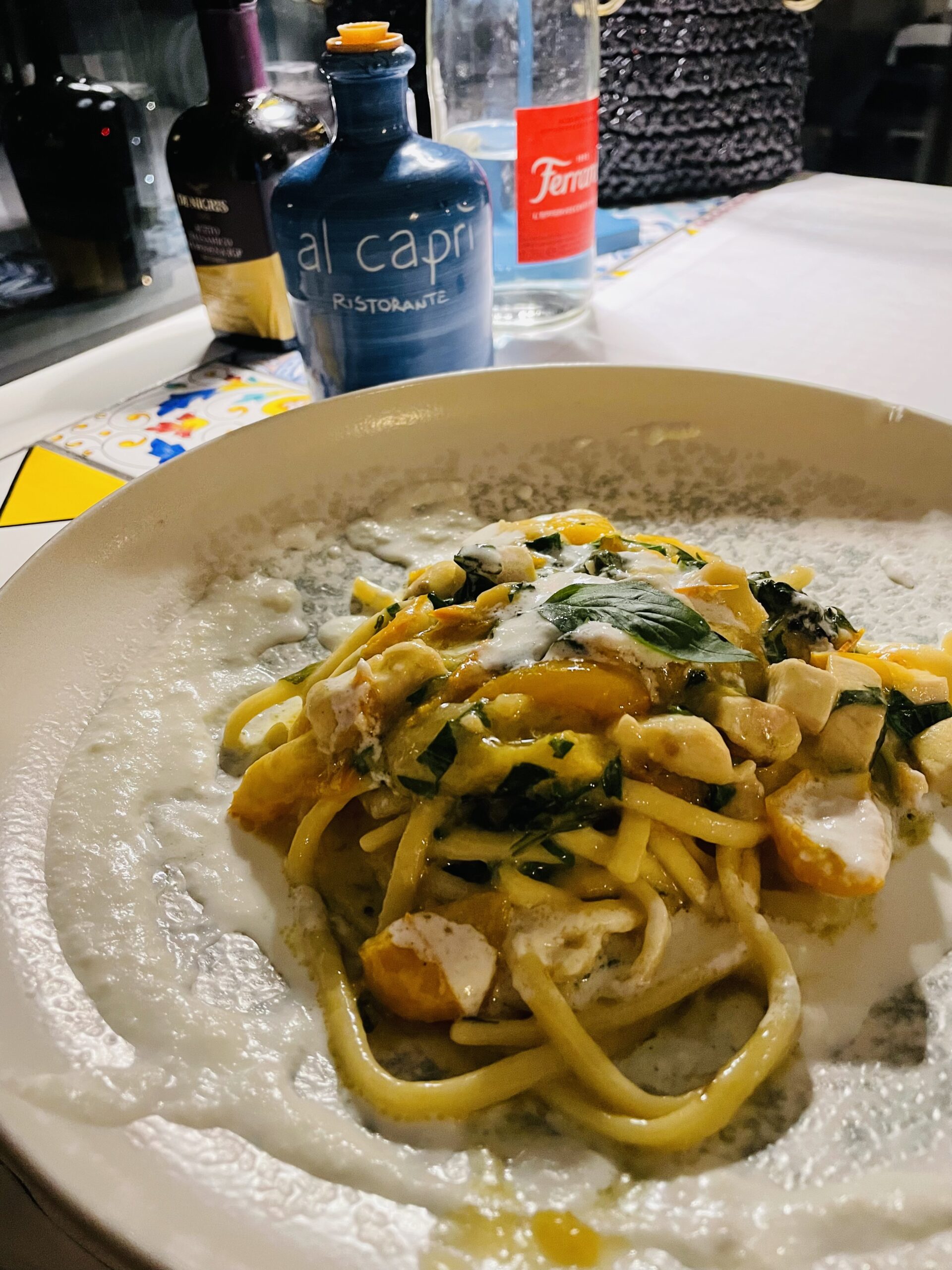 Tra le pietanze tipiche del locale si annoverano anche uno splendido scialatiello con pomodorini gialli, pesce spada e burrata, il tipico raviolo caprese e lo spaghetto alla nerano.