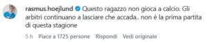 Quando è accaduto a Hojlund, si è voltato verso l’arbitro e ha fatto vedere, alzandosi la maglietta, i segni del gesto di Mina. Il replay ha chiaro anche la dinamica. E l’attaccante del Napoli ha commentato un post di CalcioNapoli24 dicendo: “Questo ragazzo non gioca a calcio. Gli arbitri continuano a lasciare che accada ciò… Non è la prima volta in questa stagione“.