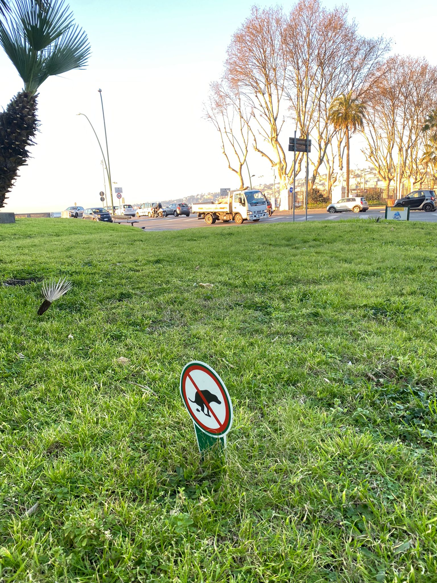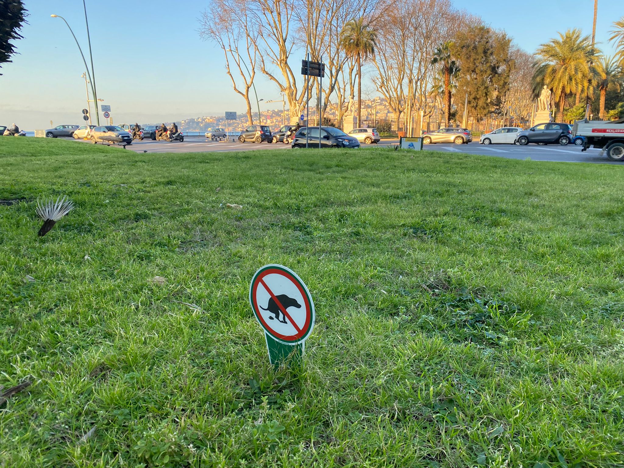 A quando il cartello con il divieto (per gli umani) di defecare nei giardini pubblici? Accade a Napoli, nella centralissima piazza Vittoria, a due passi dal lungomare di via Caracciolo.