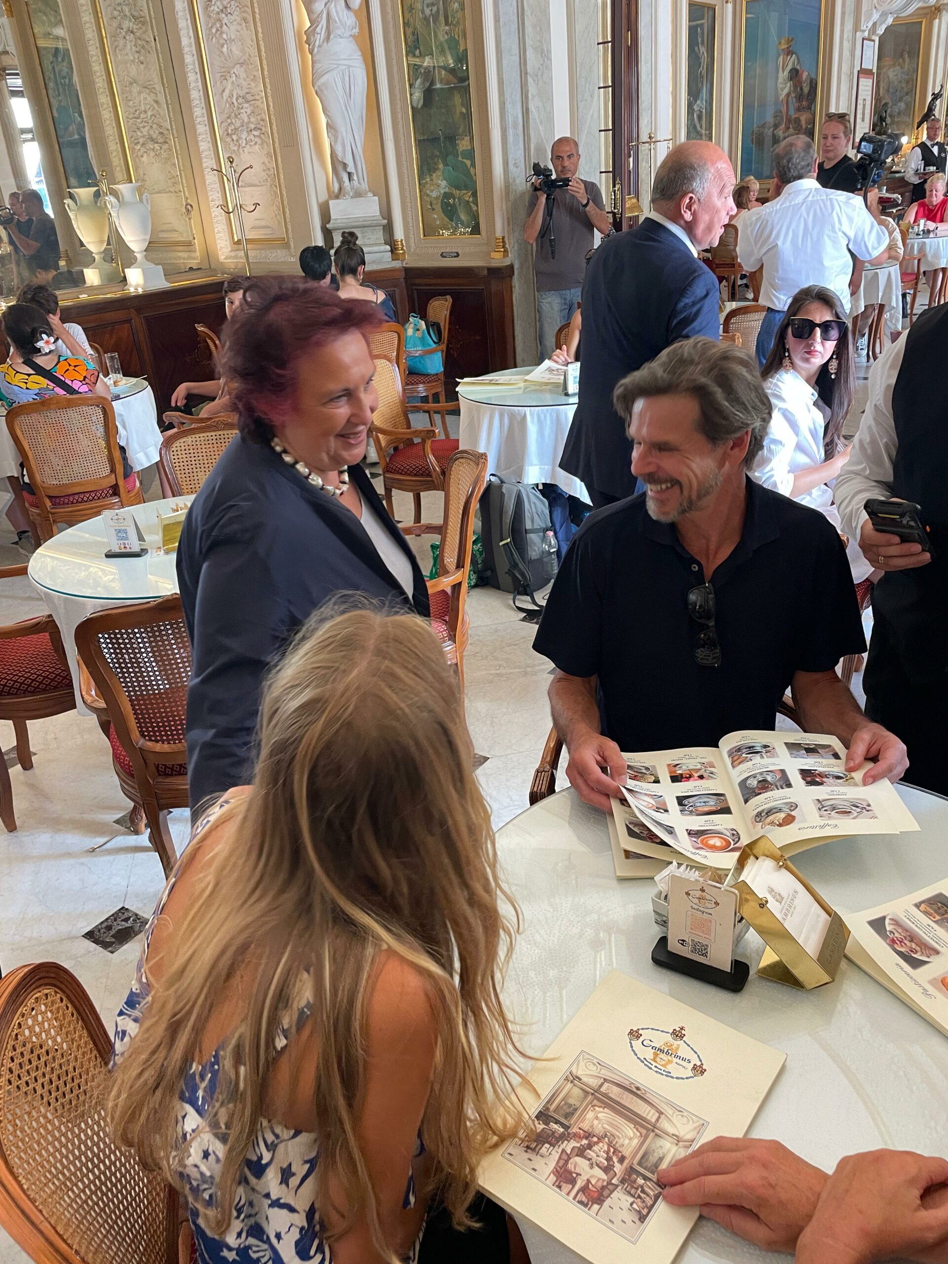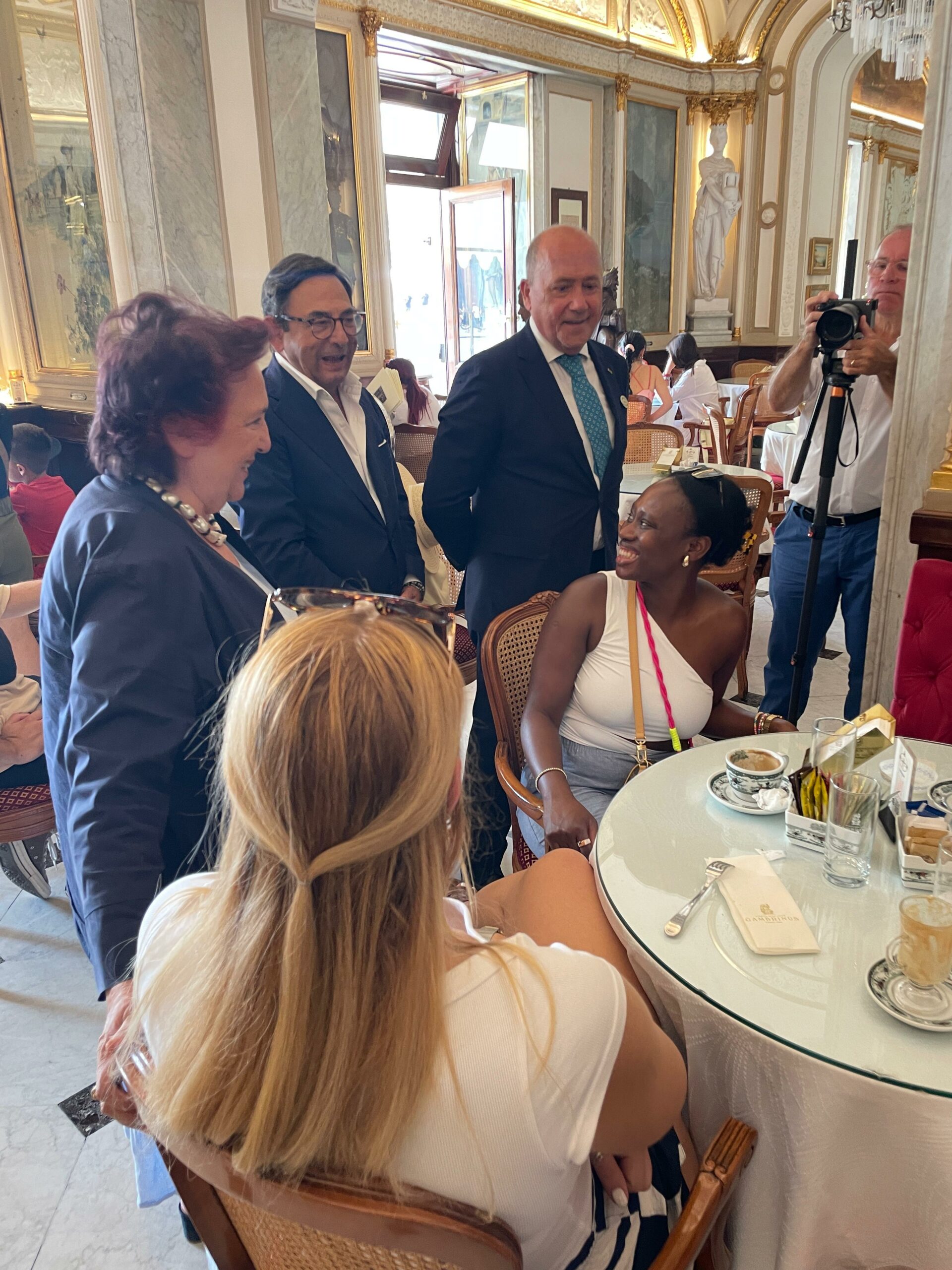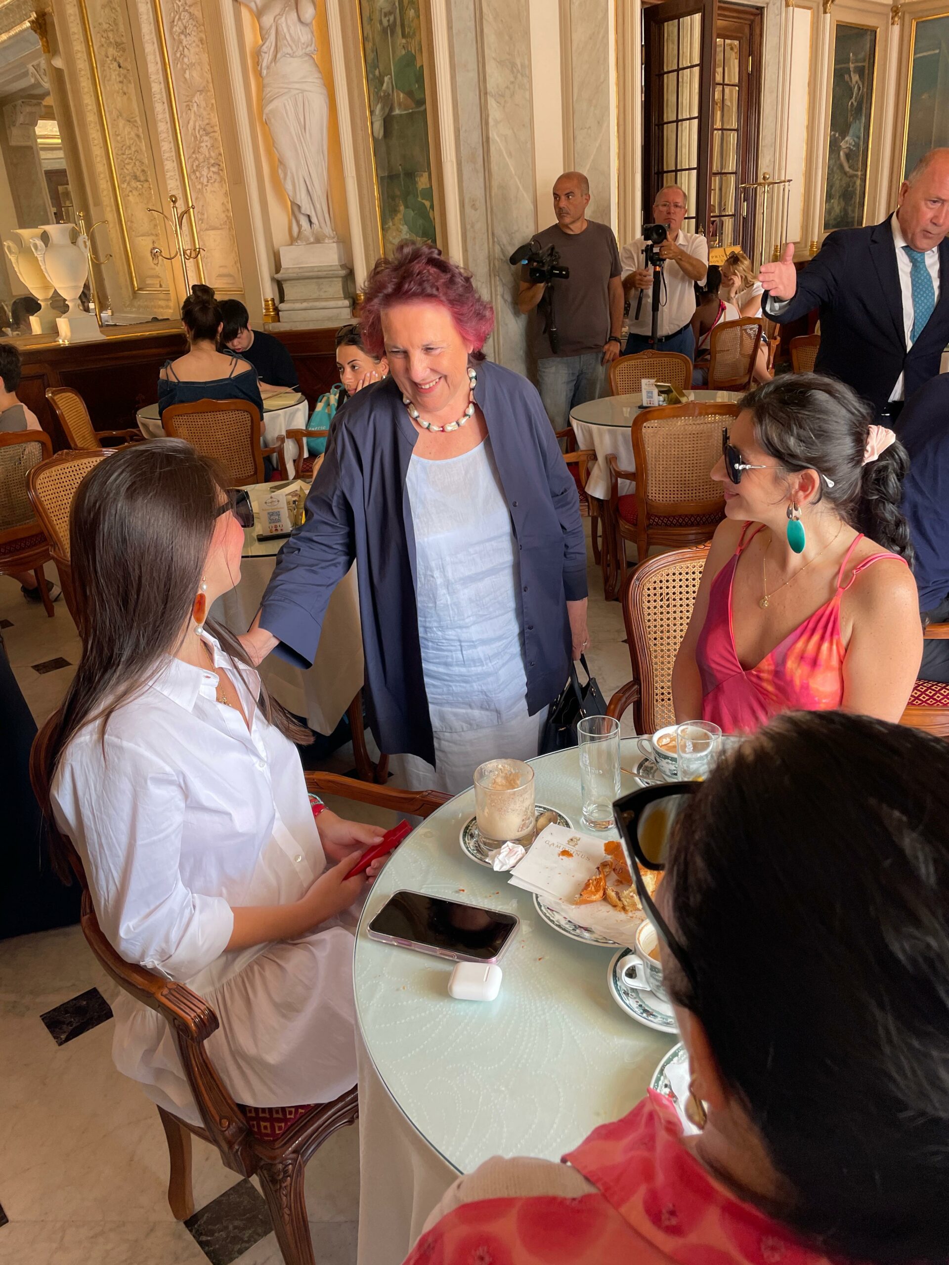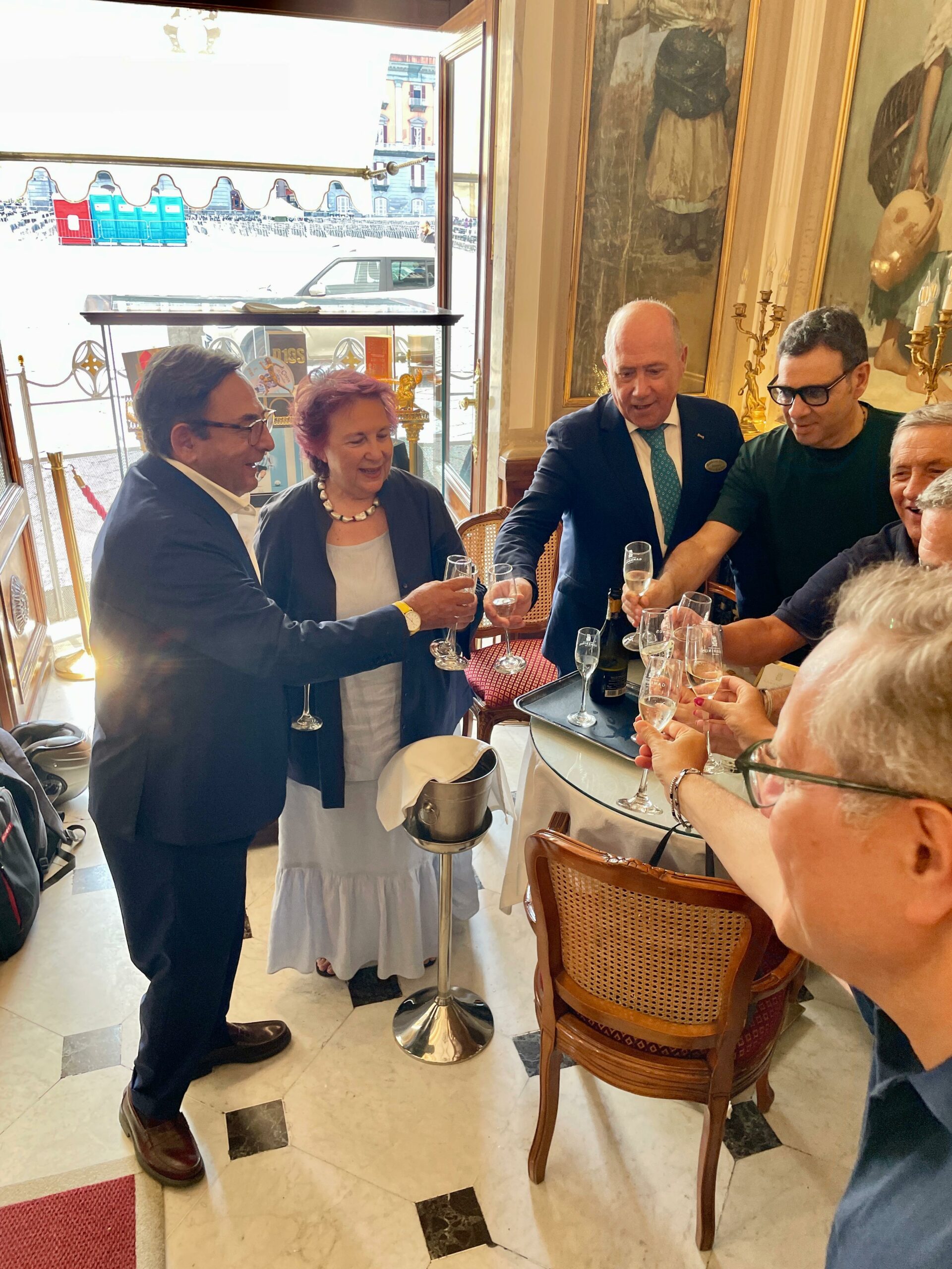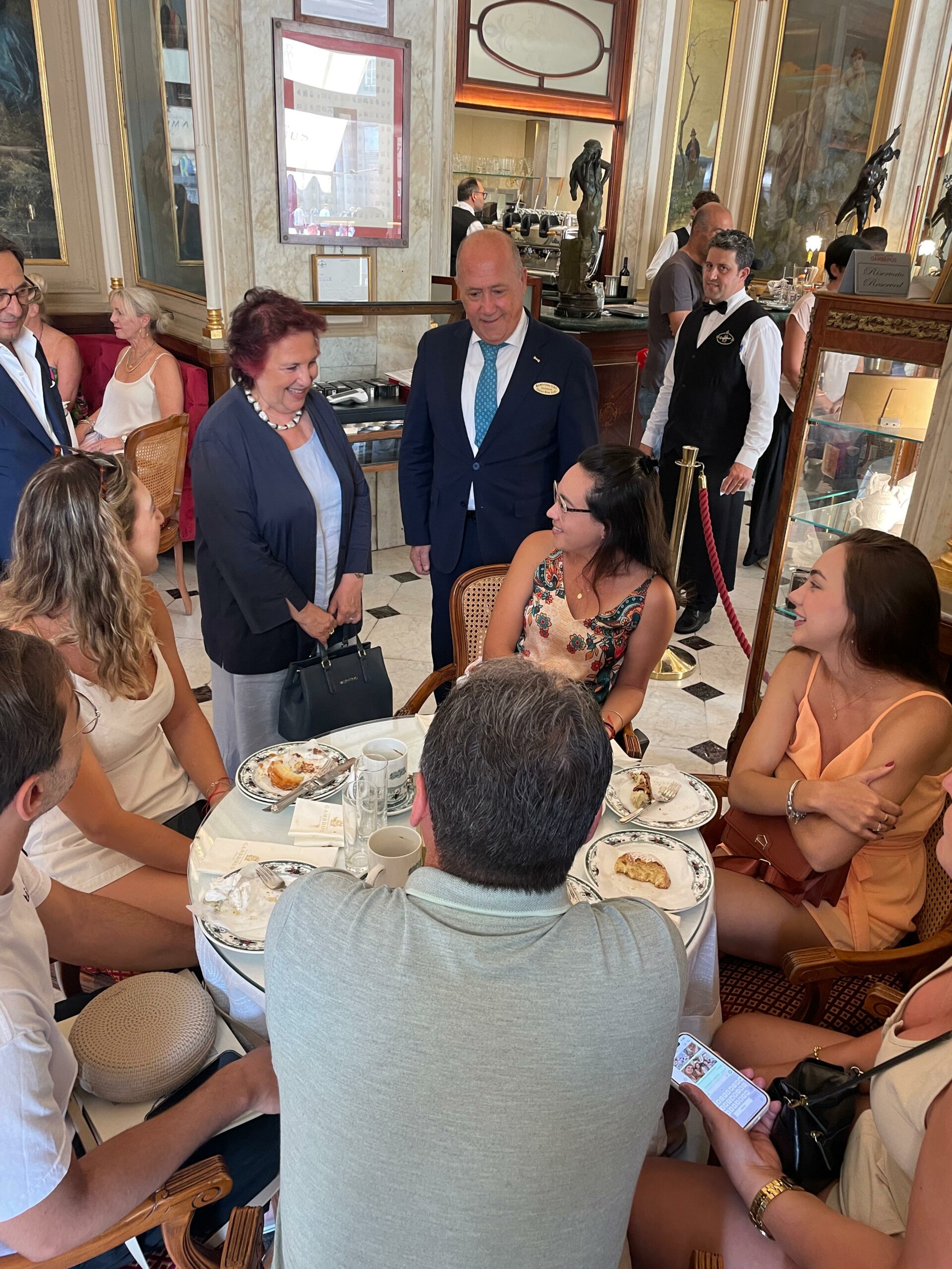 Il tradizionale brindisi di Ferragosto al Gran Caffè Gambrinus con la famiglia Sergio-Rosati, è stata occasione per incontrare i tanti turisti seduti ai tavolini nella sala del tè dello storico caffè di Piazza Trieste e Trento. «A Napoli stanno arrivando persone da ogni angolo del mondo. Ho avuto il piacere di salutare e dare il benvenuto in città a turisti in arrivo da Stati Uniti, Francia, Messico, Kuwait, Ungheria, Giappone, Nuova Zelanda, Turchia, Svezia, Brasile, Svizzera. Anche turisti italiani da Milano e Palermo. Napoli si conferma sempre di più una grande capitale del turismo internazionale», racconta l’assessora Armato, che ha concluso la sua mattinata con una visita e un augurio di buon lavoro ai tutor dell’infopoint turistico in Piazza Plebiscito (angolo via Cesario Console).