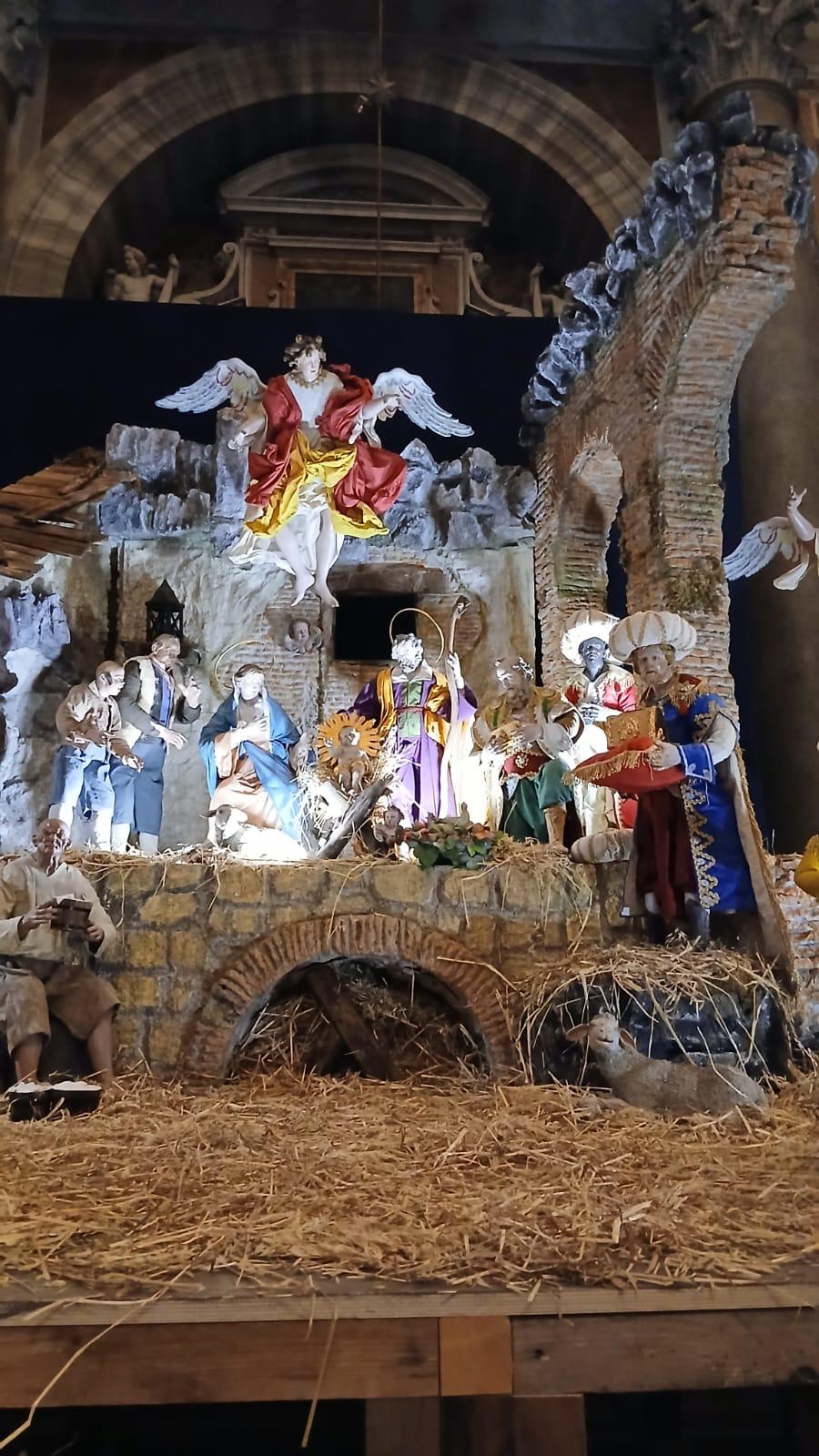 Al centro della composizione trovano posto Maria, San Giuseppe e il Bambinello, affiancati da personaggi modellati secondo la tipica produzione partenopea: figure alte circa un metro e trenta centimetri che richiamano i pastori settecenteschi. Attorno alla Natività si muove un piccolo “mondo”: tre angeli, i Re Magi, due zampognari, il classico pastore dormiente detto “Benino”, insieme a popolani, mendicanti e animali da cortile che restituiscono l’atmosfera semplice e viva di un villaggio rurale.