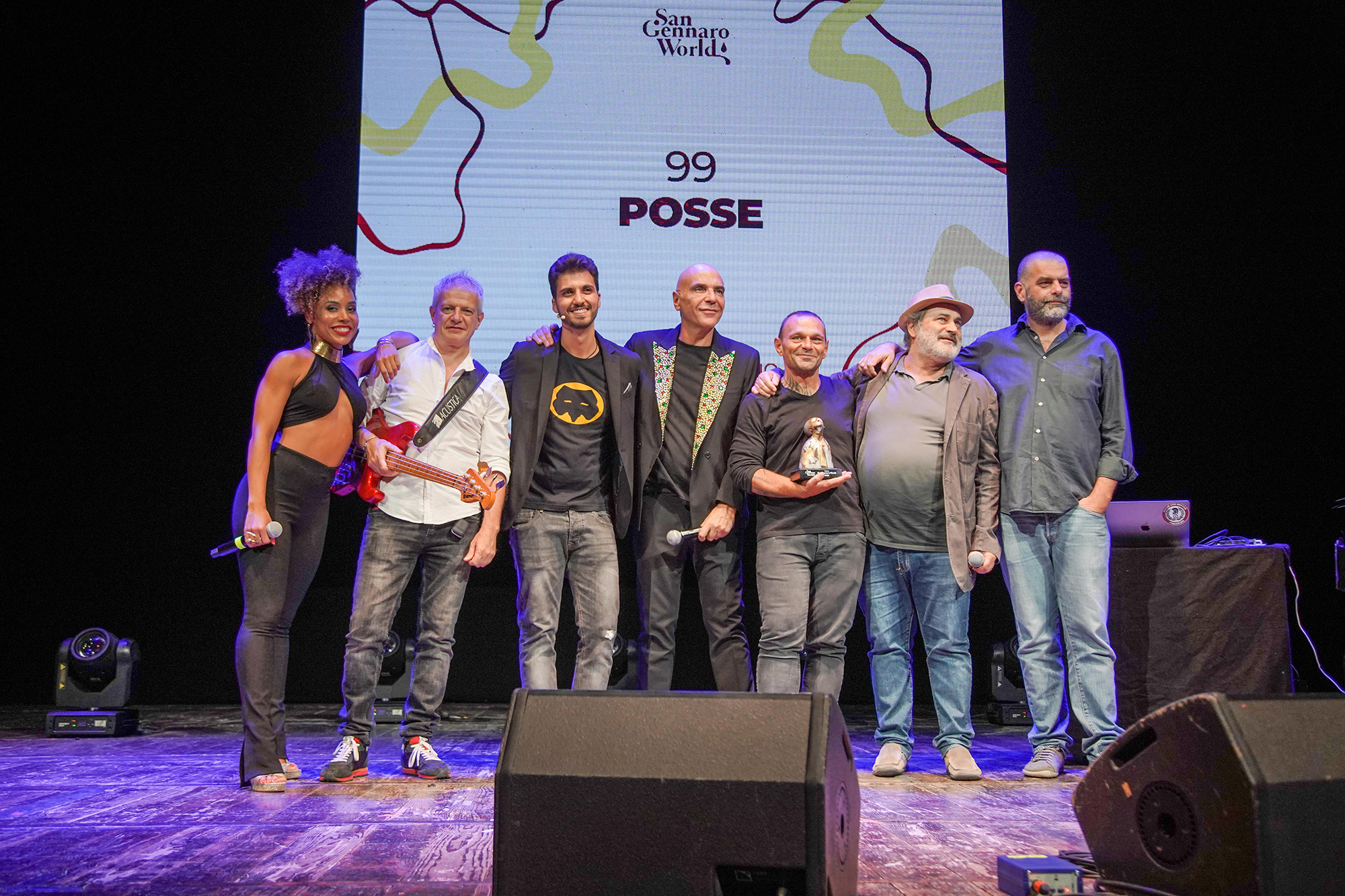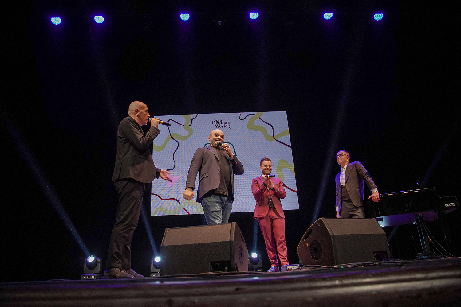 I dieci anni del Premio San Gennaro, diventato World e itinerante, sono stati celebrati al Teatro San Ferdinando con uno show straordinario. Il direttore artistico Gianni Simioli ha avuto accanto a lui sul palco tanti amici artisti. Franco Ricciardi, nelle inedite vesti di presentatore, ha duettato con Andrea Sannino in “Te voglio troppo bene” e con Maria Nazionale in “Parlame”. Premiata da Titta Fiore, presidente Film Commission Regione Campania, Maria Nazionale ha regalato alla platea le emozioni di “Santa Lucia luntana” e “Ragione e sentimento”. Ciro Capano, premiato dalla vice presidente della Camera di Commercio di Napoli Liliana Langella, ha interpretato “Canzone mbriaca” e “Guapparia”. Matteo Paolillo, premiato dall’assessore regionale Lucia Fortini, tra i protagonisti della seguitissima fiction tv “Mare fuori” nel ruolo di Edoardo Conte, ha regalato al Premio San Gennaro World una versione remix della sigla “’O mar for”. Gran finale con i 99 Posse, che, premiati dal giornalista, critico musicale e scrittore Federico Vacalebre, hanno portato sul palco del San Gennaro World tutta l’energia di “Curre Curre guagliò”. Sul palco anche Peppe Iodice con le sue divertenti incursioni e Vincenzo Comunale, Davide Scafa e Simona Boo, scelti da Simioli per presentare il premio insieme a lui.