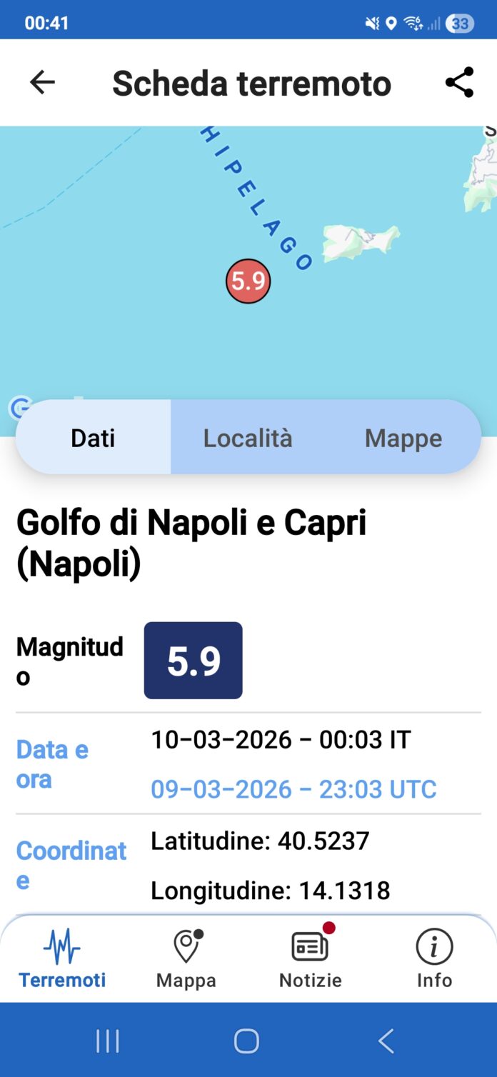 Una scossa fortissima di terremoto, la cui magnitudo è stata fissata in 5.9 è stata registrata dai sismografi ne Golfo di Napoli. L’epicentro è stato calcolato al largo dell’isola di Capri, a una profondità di oltre 400 chilometri.